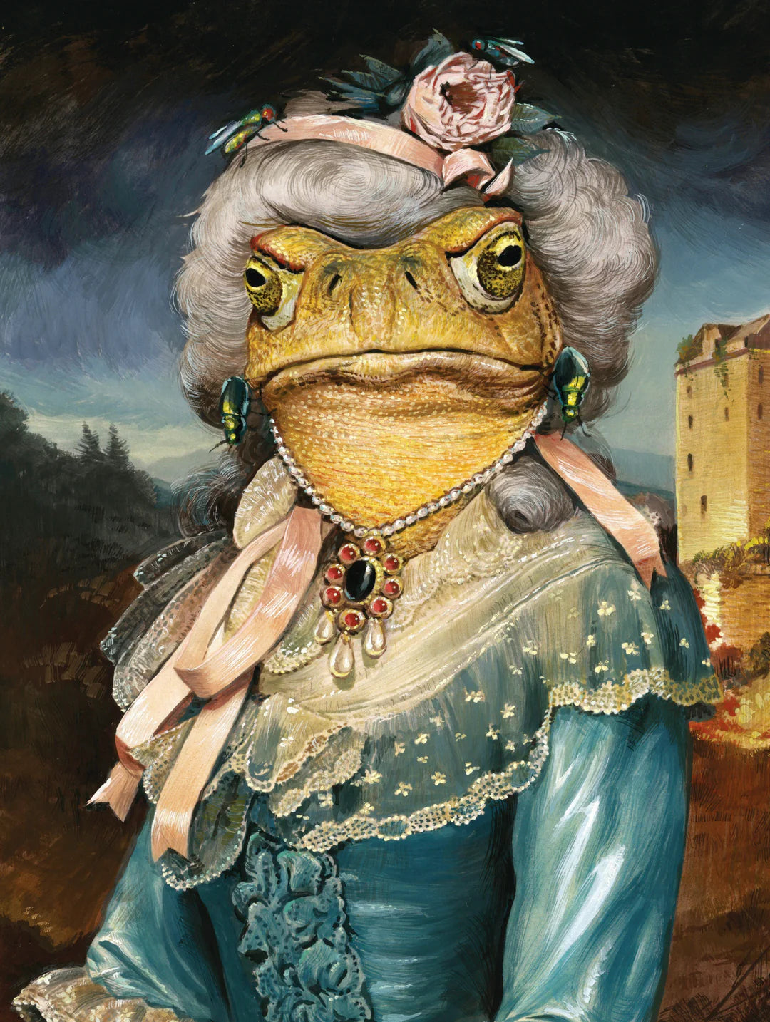 Meet Bell of the Bog—a vibrant 500 piece jigsaw puzzle illustrated by Bill Mayer, where high fashion meets the murky magic of the bog. At the center of the scene is a stunning bell frog dressed to impress, adorned with a head-turning gown, sparkling bug-inspired jewelry, and a tiara fit for royalty, complete with roses and flies.