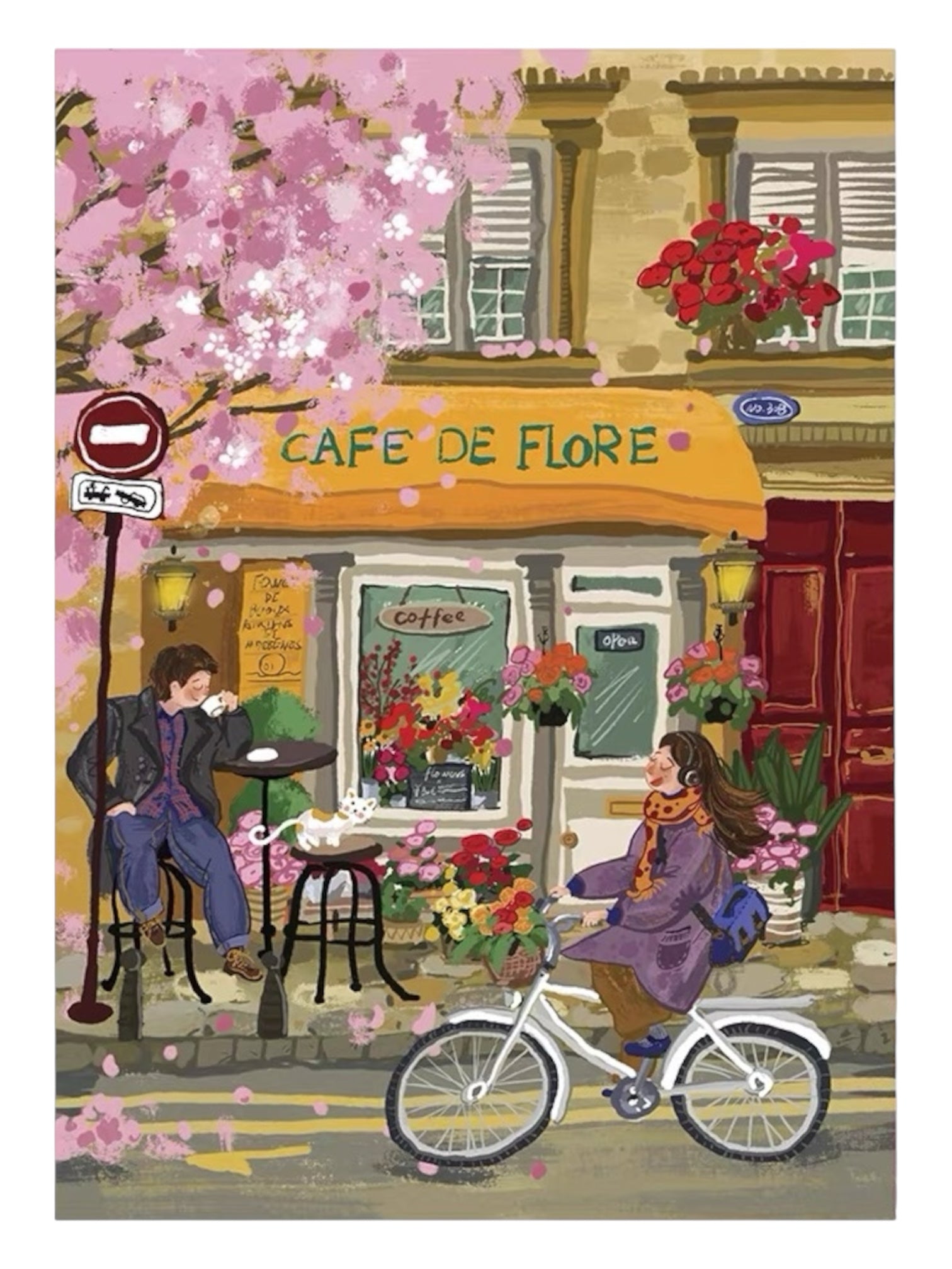 Inspired by the charm of Parisian café life, Café de Flore captures a romantic street scene filled with blooming flowers, gentle spring light, and unhurried moments. Beneath soft pink blossoms, café tables invite quiet conversation while a cyclist passes by, creating a warm and timeless snapshot of everyday beauty.