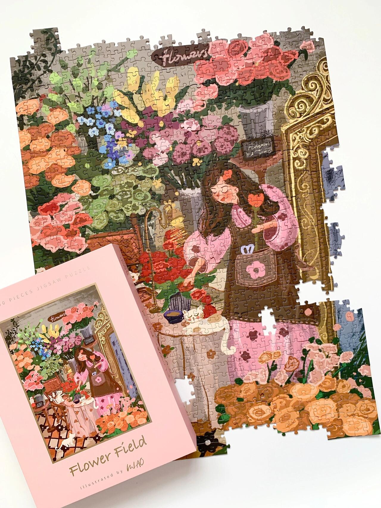 Step into a dreamy flower shop scene with Flower Field, a beautifully illustrated puzzle filled with soft colors, blooming florals, and gentle details. The artwork captures a quiet, romantic moment surrounded by flowers, creating a calming and joyful puzzle experience.