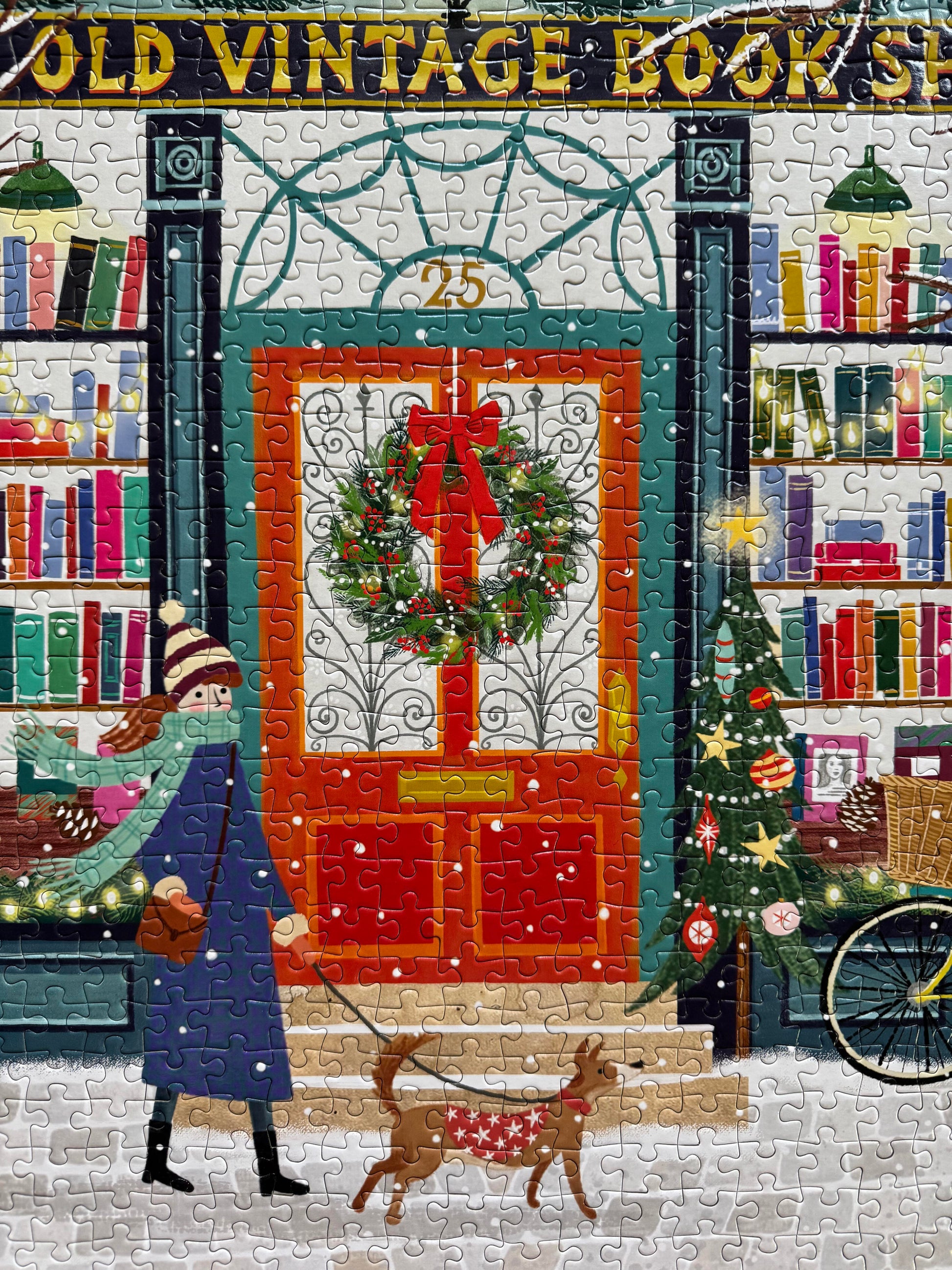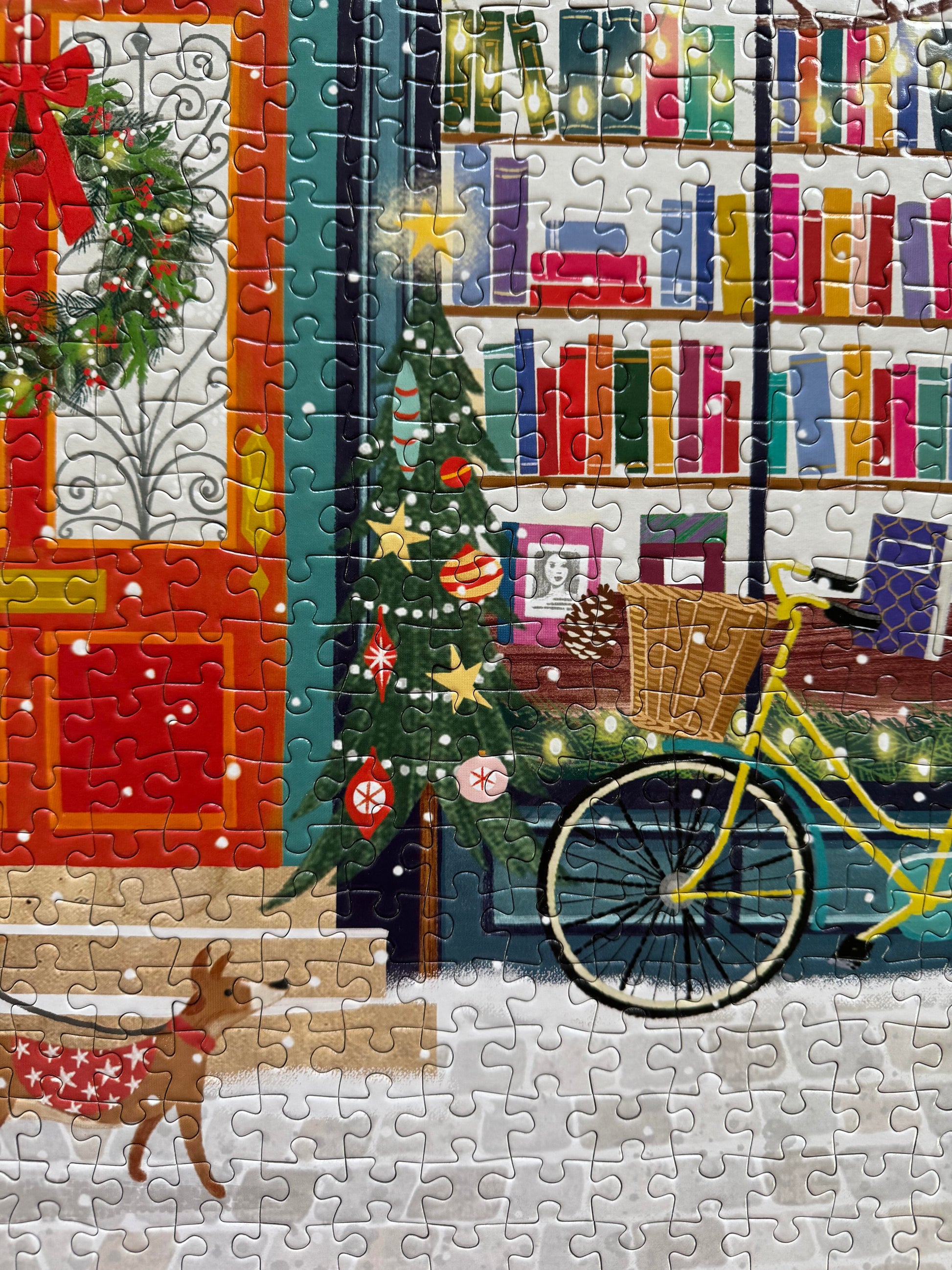 The scene is filled with warm festive details—twinkling lights, colorful book displays, a cheerful winter wreath, and a peaceful snowy street. Every piece brings you closer to a heartwarming moment of calm and creativity.