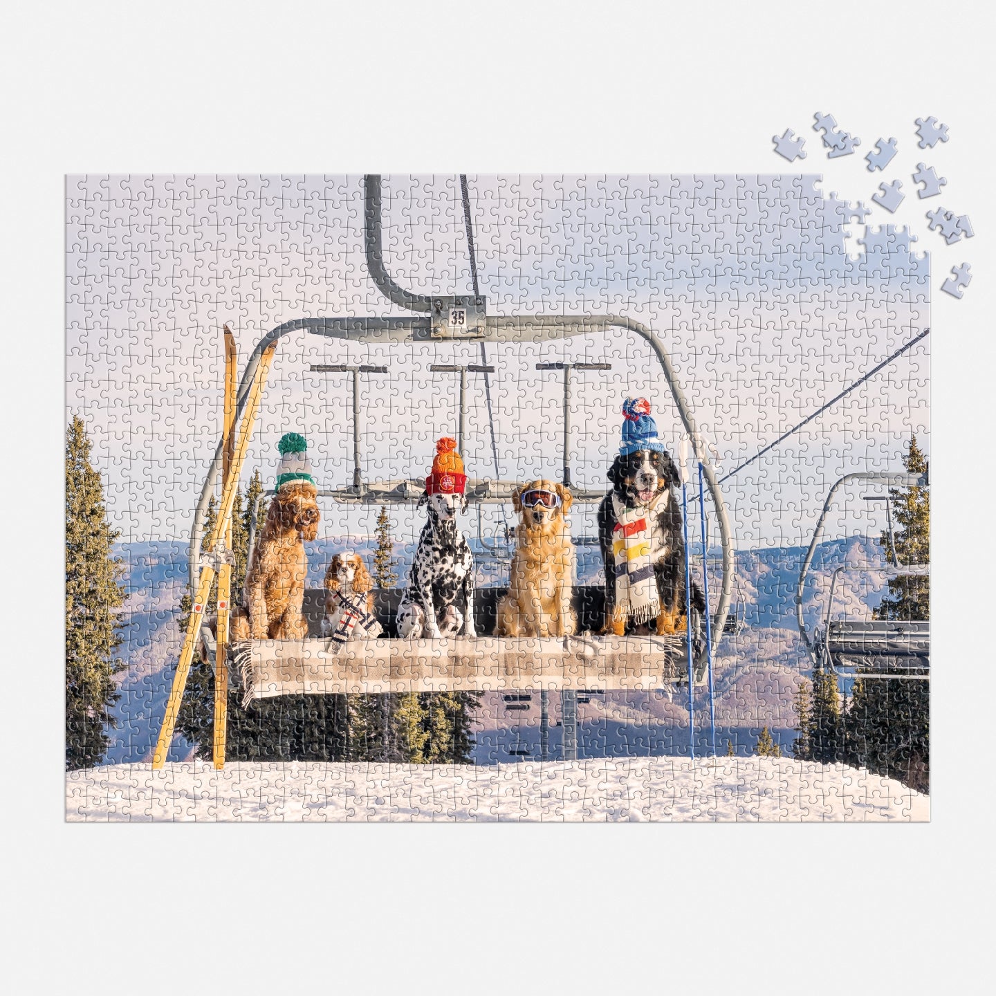 1000 PIECE PUZZLE - Come on a snowy journey with our beautiful 1000-piece puzzle featuring these stylish pups on a ski lift in Aspen, captured through the lens of renowned photographer Gray Malin. Packaged within a box cleverly disguised as a book with a magnetic closure, this puzzle promises an experience both fun and engaging. As you unravel the puzzle's intricacies, feel the sense of accomplishment with each fitting piece, and witness the scene come to life.