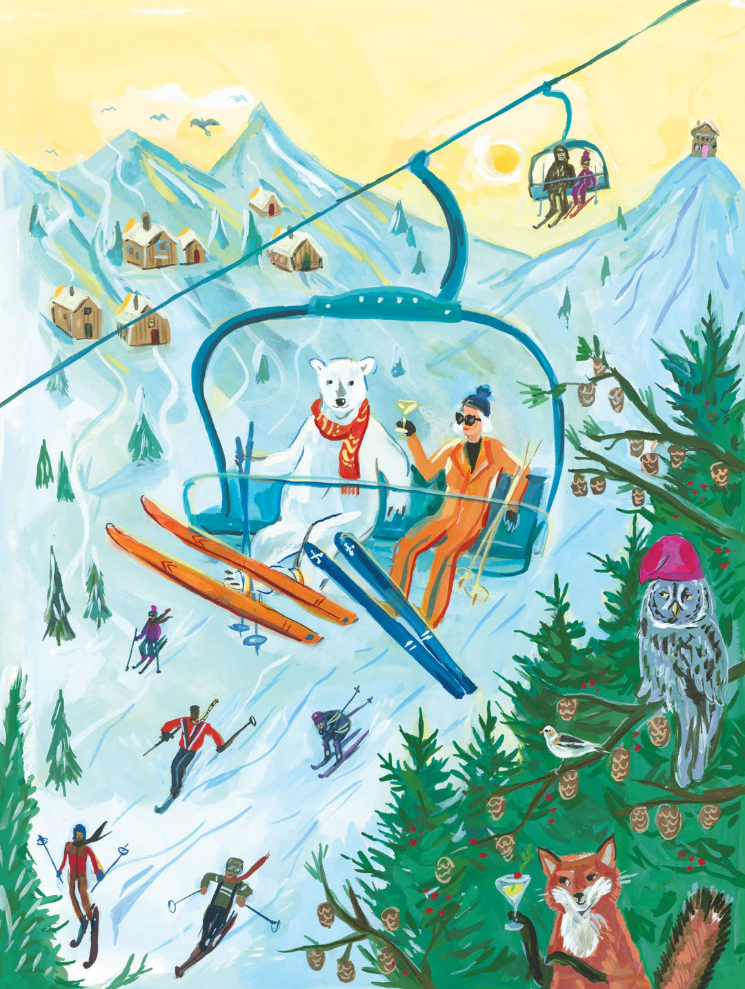 Below, the lively ski trails are bustling with skiers enjoying a perfect powder day, while cozy mountain cabins dot the distant landscape. Look a little closer, and you’ll discover charming woodland surprises hidden among the trees—like an owl in a beanie and a fox casually sipping a cocktail of its own.