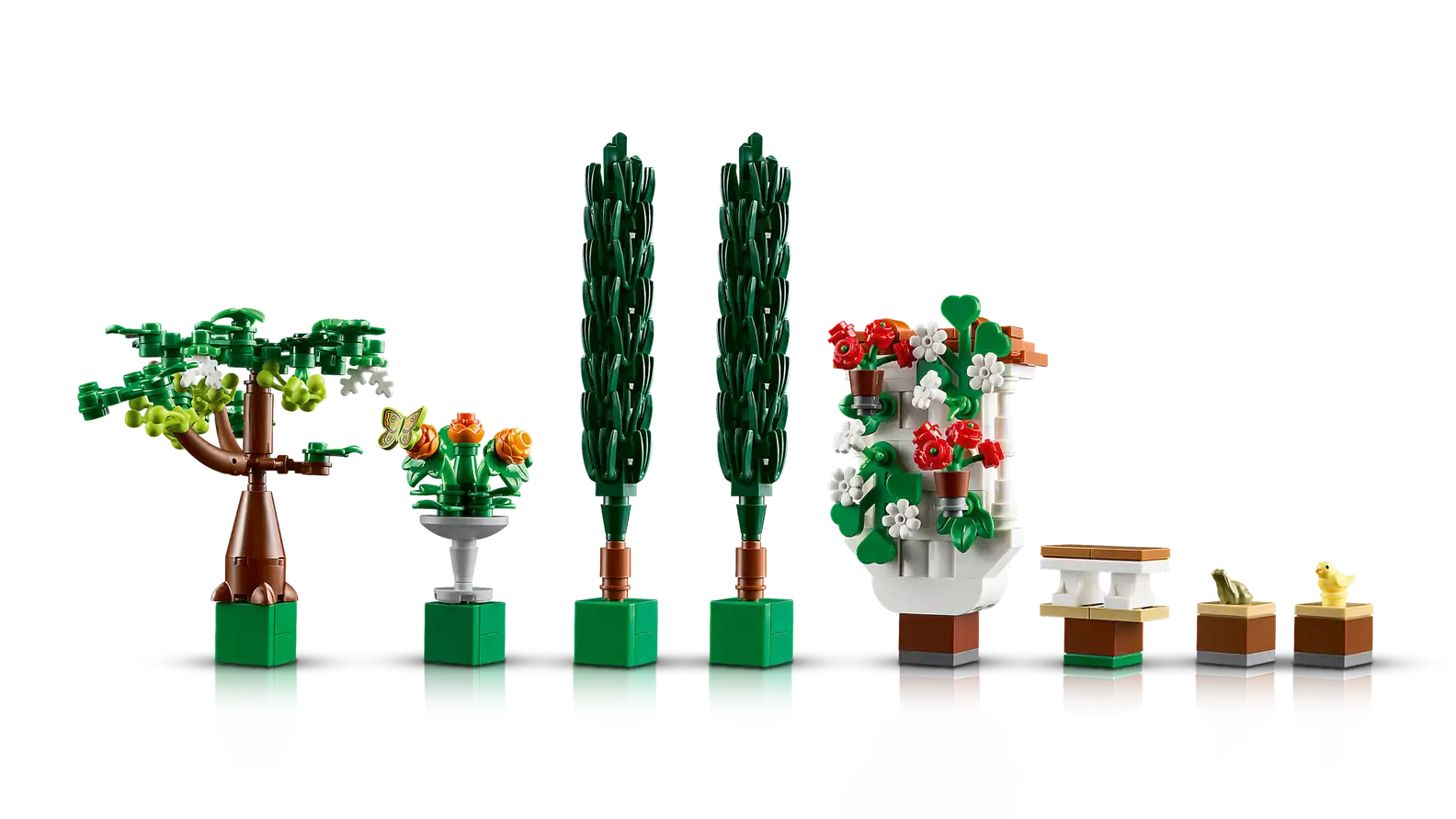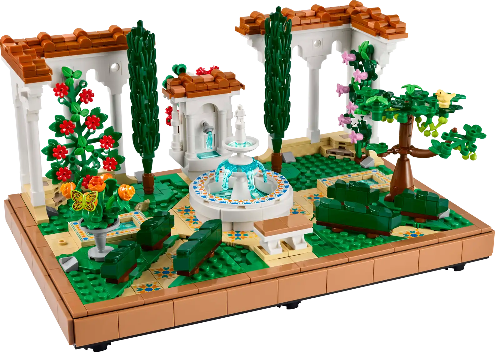 - What’s in the box – The LEGO® Fountain Garden features a tiered fountain, lavabo, 2 cypress trees, flowering grape vines, 4 pergolas and tiled pathways, plus luna moth, bird and frog figures