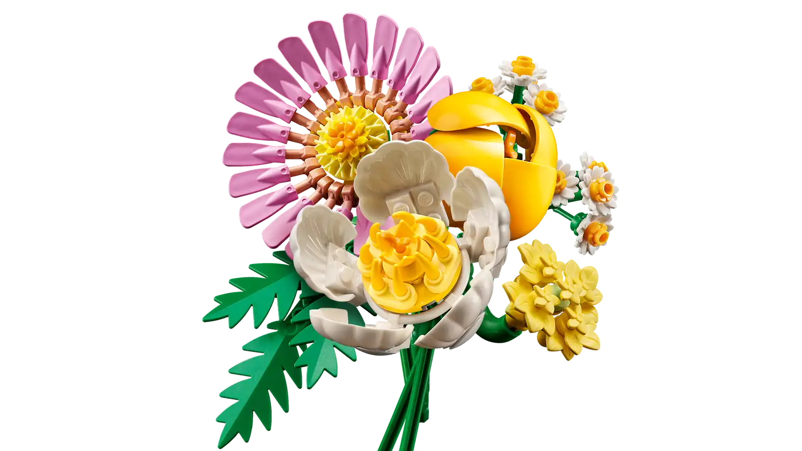- LEGO® flowers – The bouquet blooms with 6 species of spring flowers in pastel shades, including Billy buttons, bluebells, Cleopatra ferns, yellow yarrows, a gerbera, a peony and a tulip