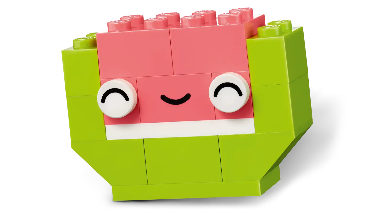 - Assorted bricks and fun elements – Includes colorful building bricks in a varietyof shapes, plus special pieces, such as eyes, mouths and decorative elements