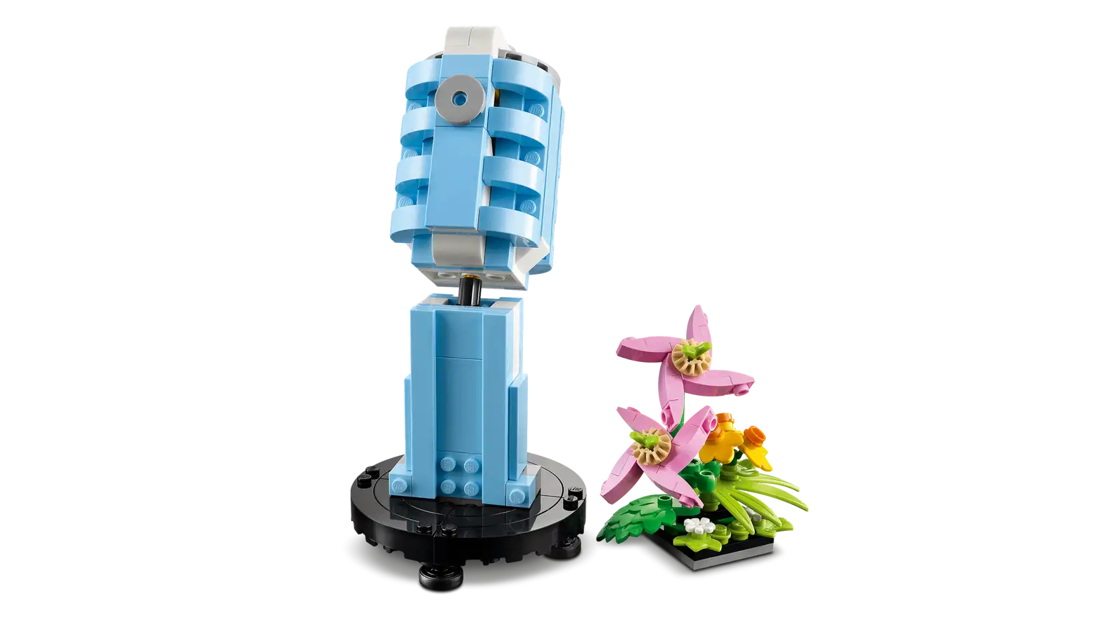 LEGO fans have the choice of 3 different music set building options: a record player with flowers; a retro-style radio toy with moving buttons, an adjustable aerial and removable flowers; or a rotating classic microphon e with a stand of flowers. Each model can be used for fun role play or as an attractive home decor display item.
