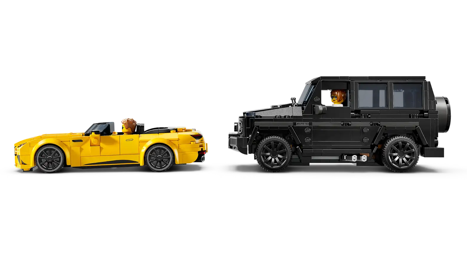 The Mercedes-AMG G 63 black G-class and the Mercedes-AMG SL 63 yellow convertible roadster models both include authentic design details from the real-life versions, including front grilles, hoods, and interior features. Each Mercedes-AMG toy also comes with a driver minifigure for kids to place behind the wheel to enjoy races on the track.