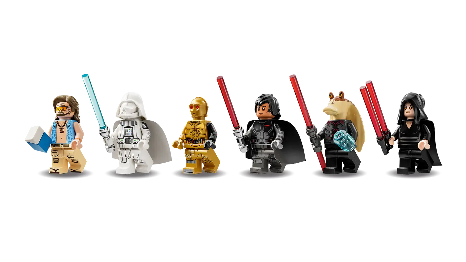 - 6 LEGO® Star Wars™ minifigures – Darth Jar Jar, Bounty Hunter C-3PO, Darth Dev, Darth Rey, Beach Luke and Jedi Vader, plus accessories including lightsabers and a blue milk carton
