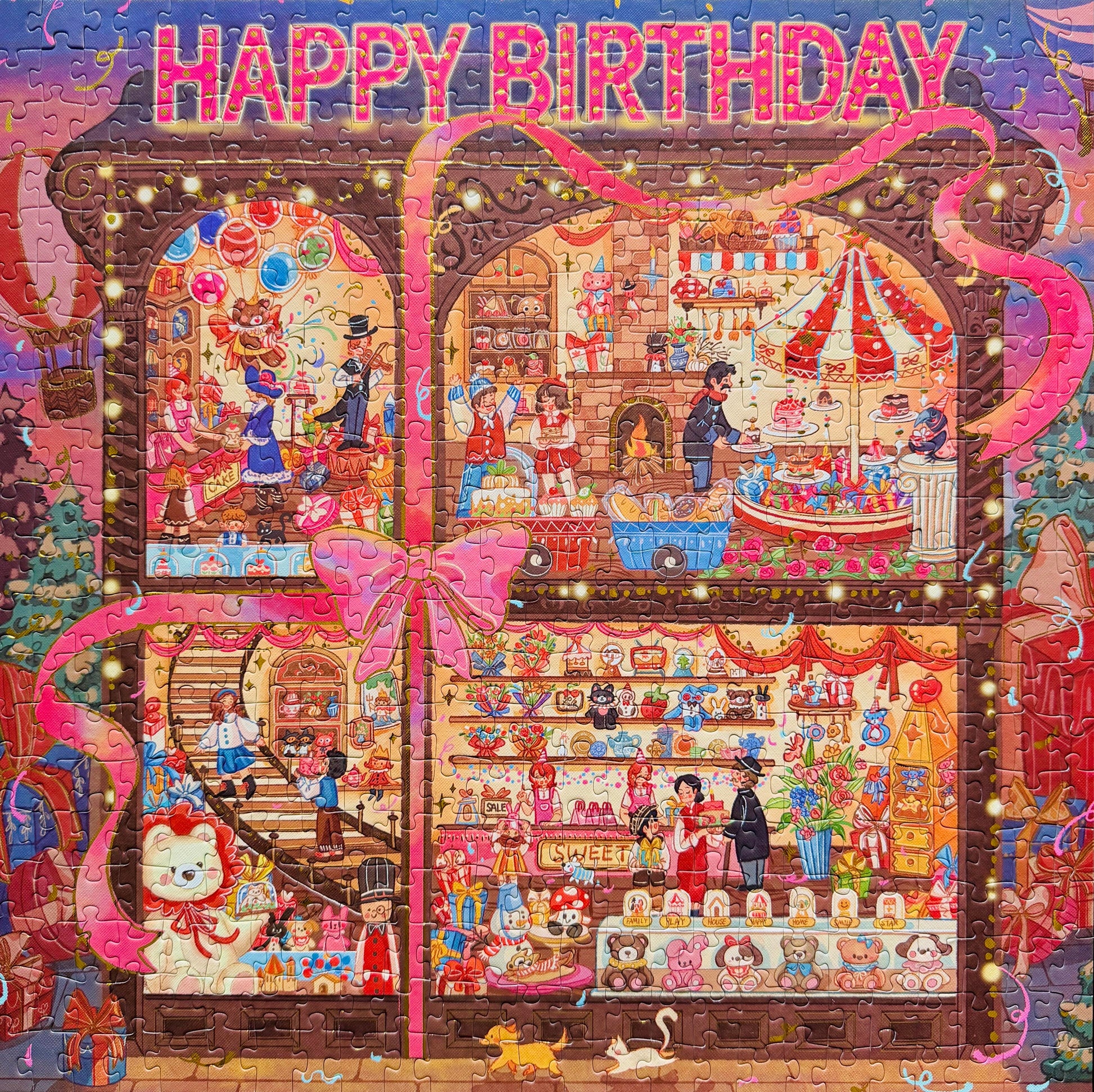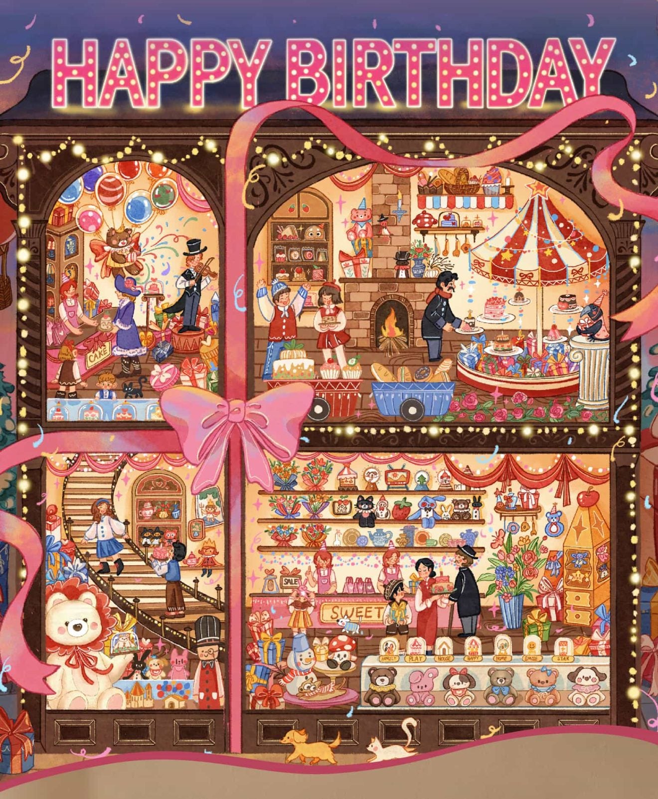 This charming illustration captures a whimsical birthday celebration inside a candy-filled wonderland — complete with balloons, cakes, and adorable characters. Every detail sparkles with magic and warmth, making it a delightful gift or a cozy activity to enjoy on special days.