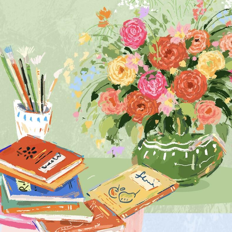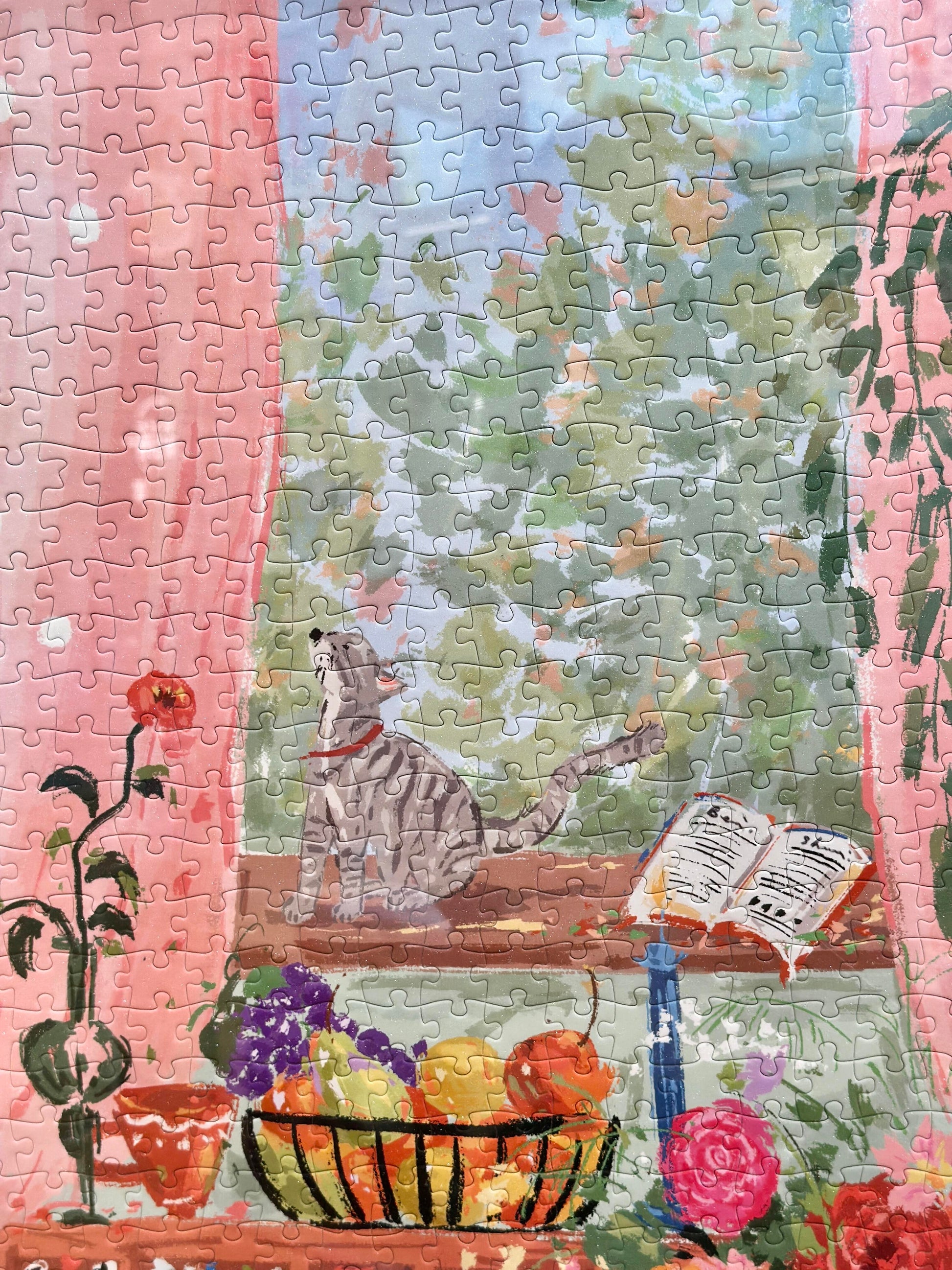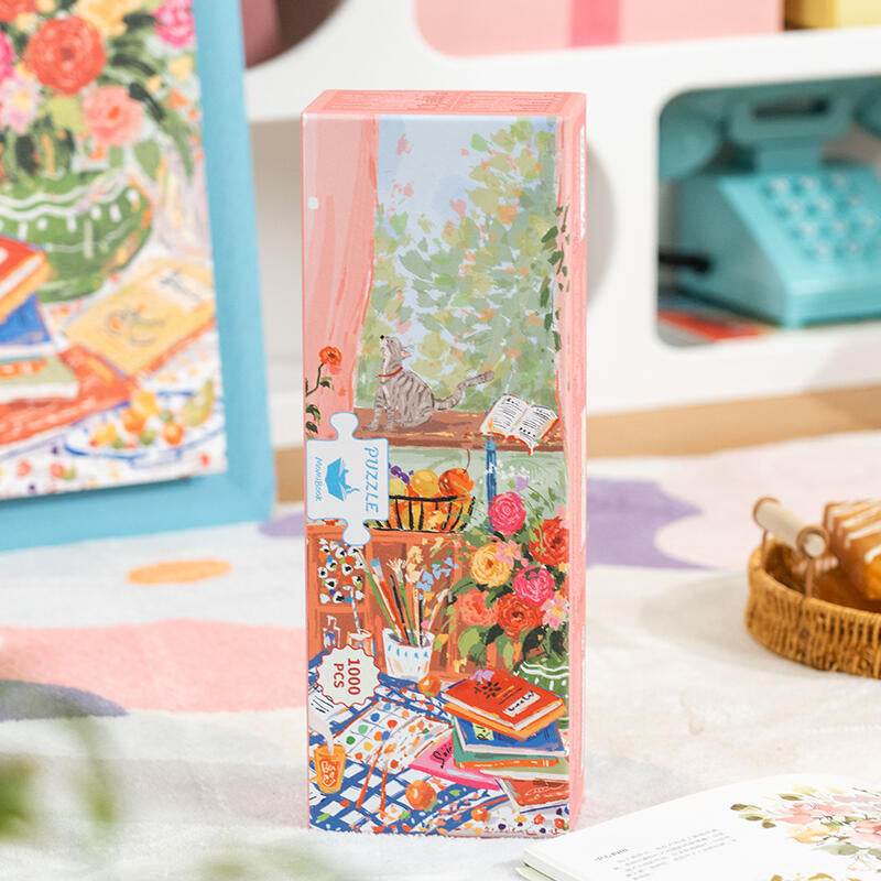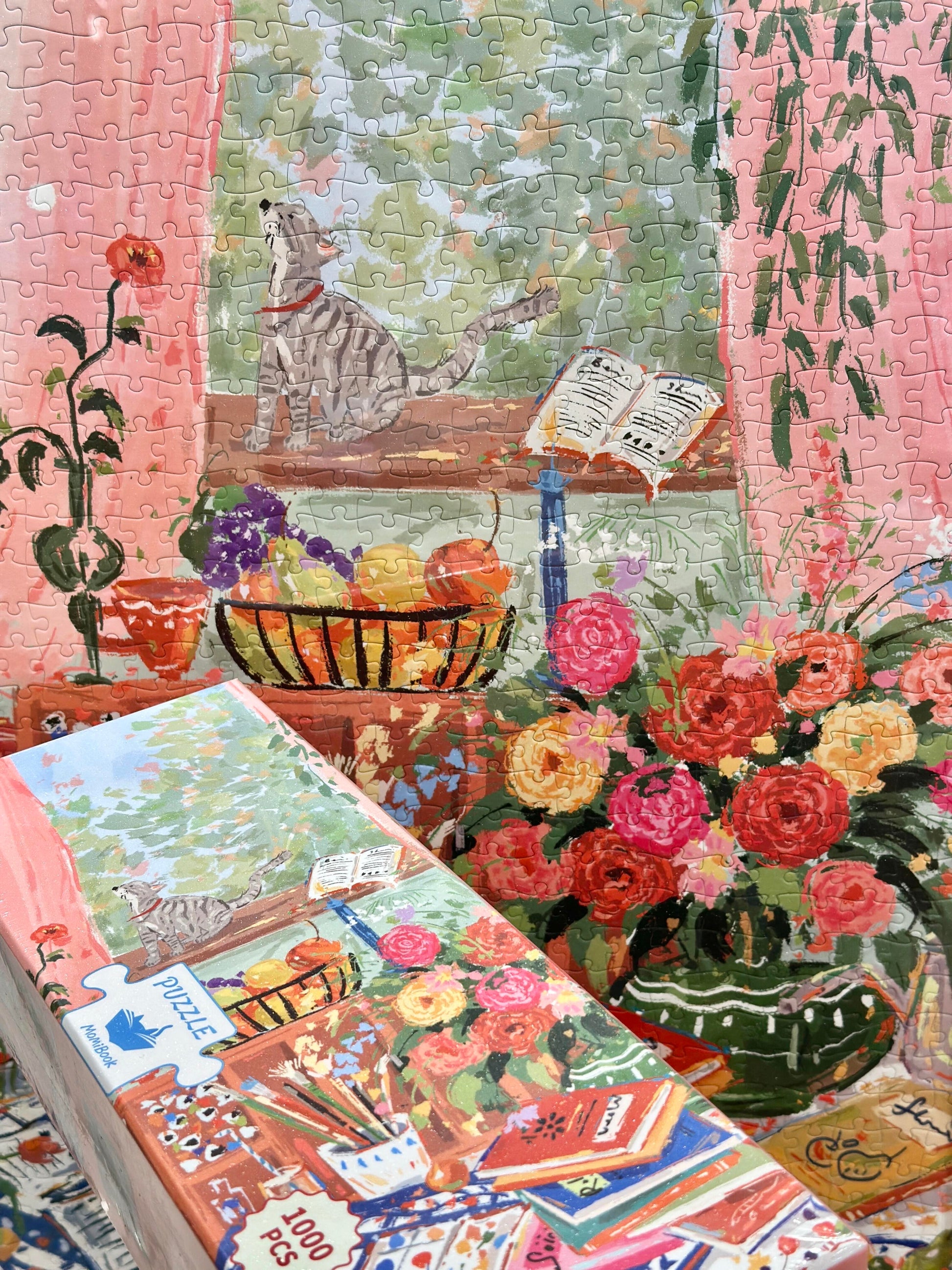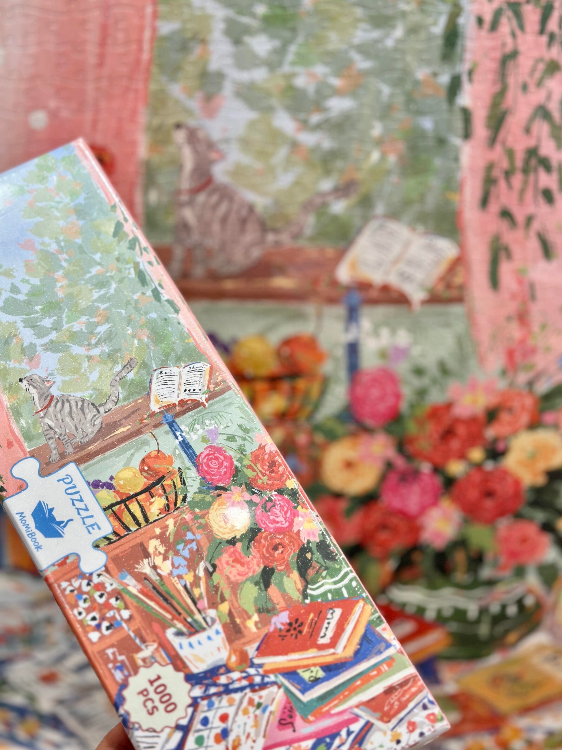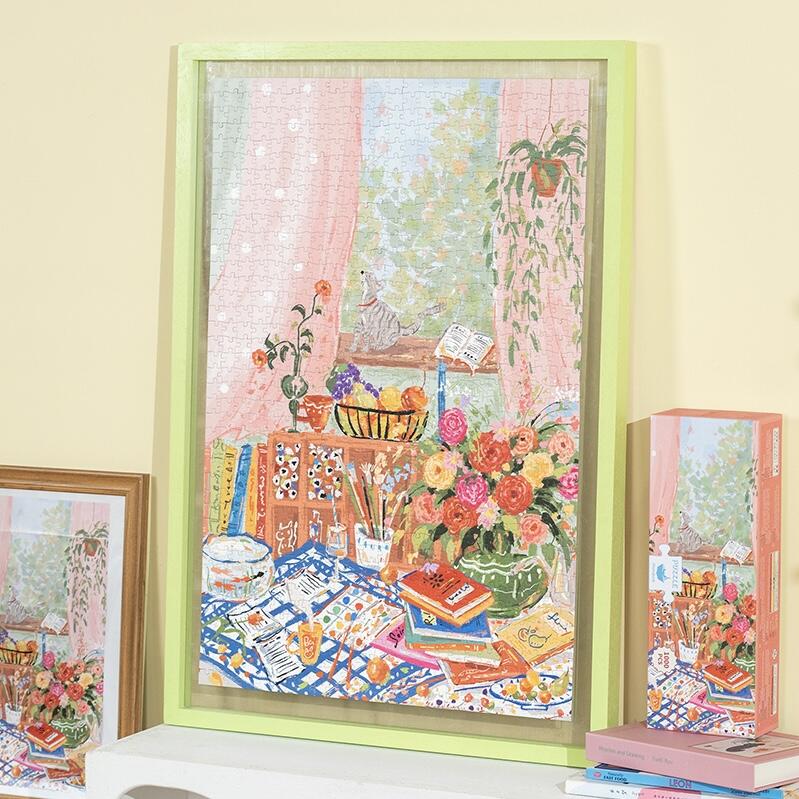 A softly illustrated puzzle featuring a cozy indoor scene filled with books, flowers, art supplies, and gentle sunlight drifting through the window. Warm colors and painterly textures create a calm, comforting puzzling experience that invites you to slow down and enjoy the moment. Perfect for book lovers, cozy home enthusiasts, or anyone who enjoys peaceful, mindful puzzle time.