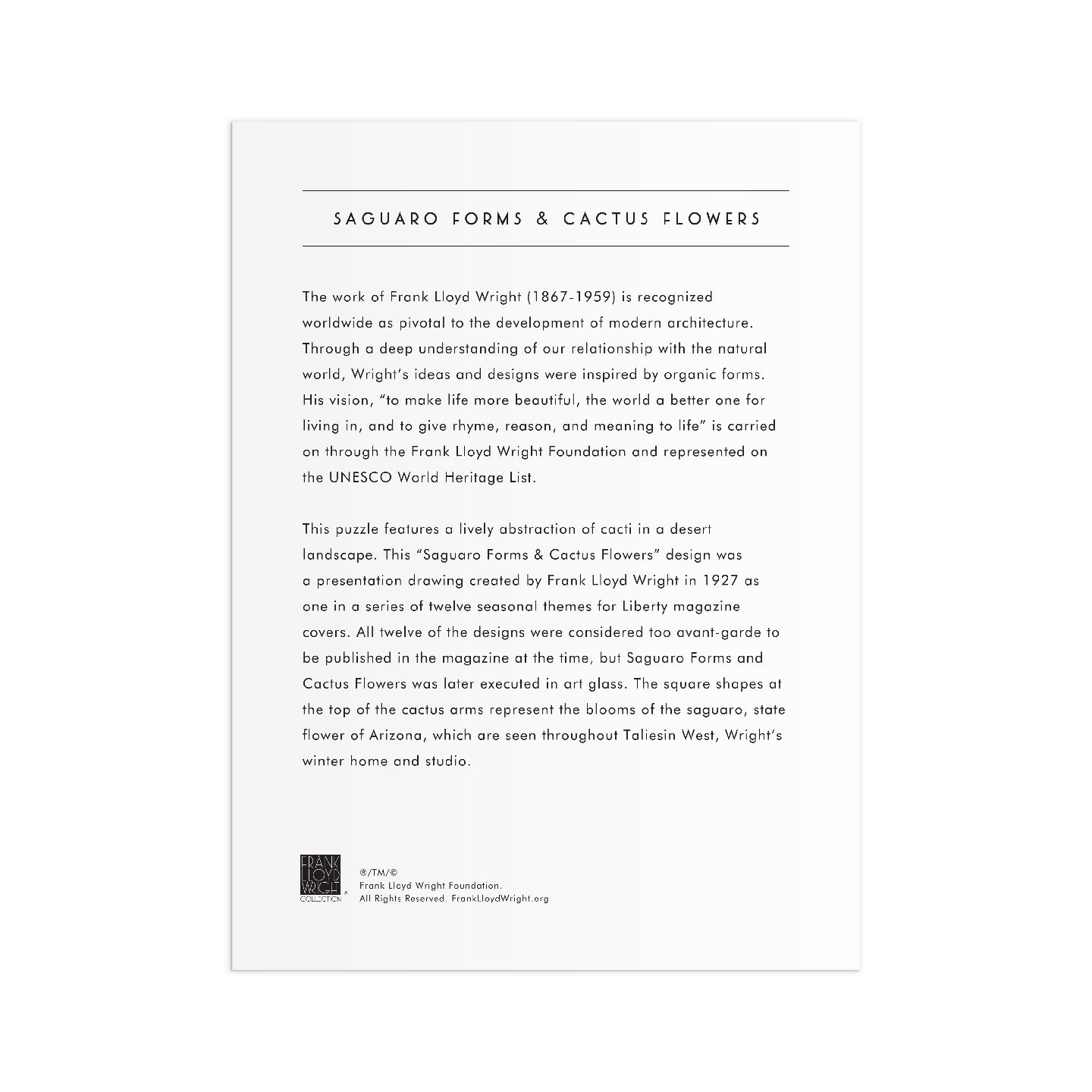 750-PIECE PUZZLE - Celebrate the visionary artistry of Frank Lloyd Wright with the Saguaro Cactus & Forms 750 Piece Shaped Foil Puzzle from Galison. Inspired by one of Wright's most iconic desert-themed textile designs, this uniquely contoured puzzle offers an immersive and engaging challenge. Measuring 21.5" x 27", it features foil-stamped accents that highlight the striking geometric lines and color contrasts of this Southwest-inspired masterpiece.