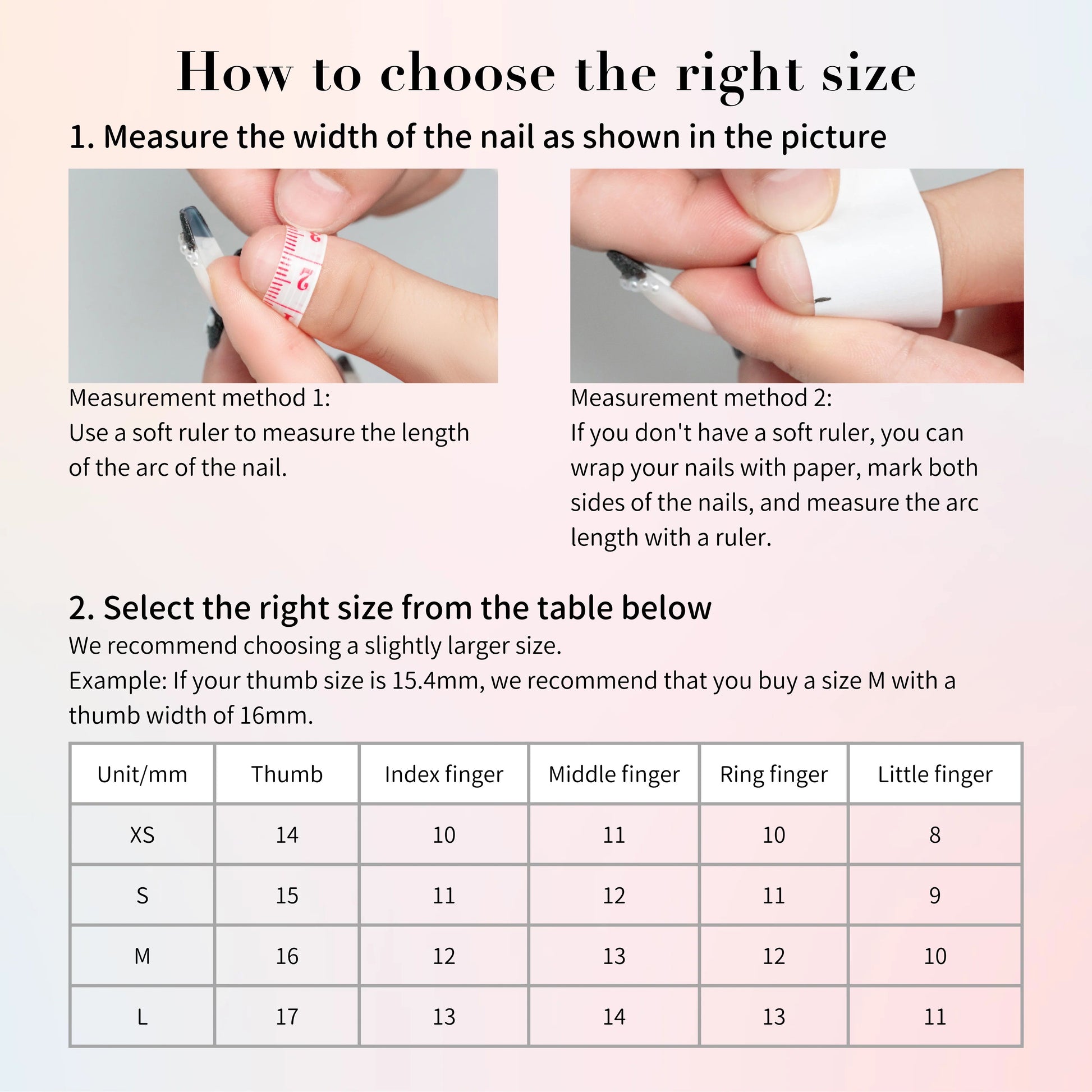 1. With a measuring tape, measure the widest part of your nail horizontally using the metric system (centimeters) side of the tape.Starting with your thumb.