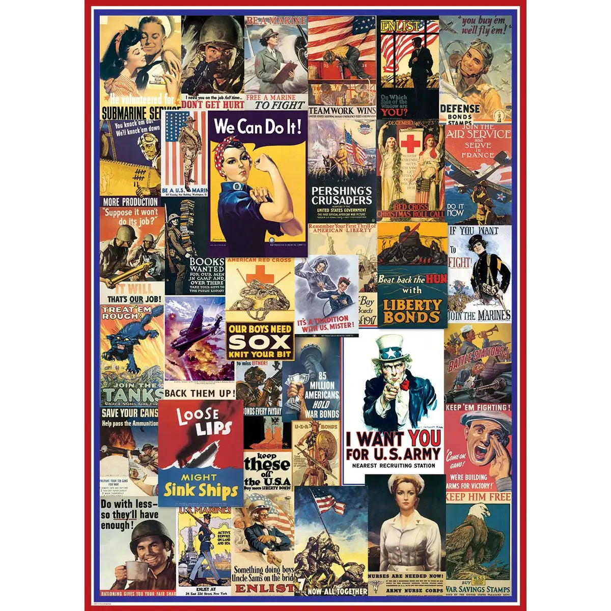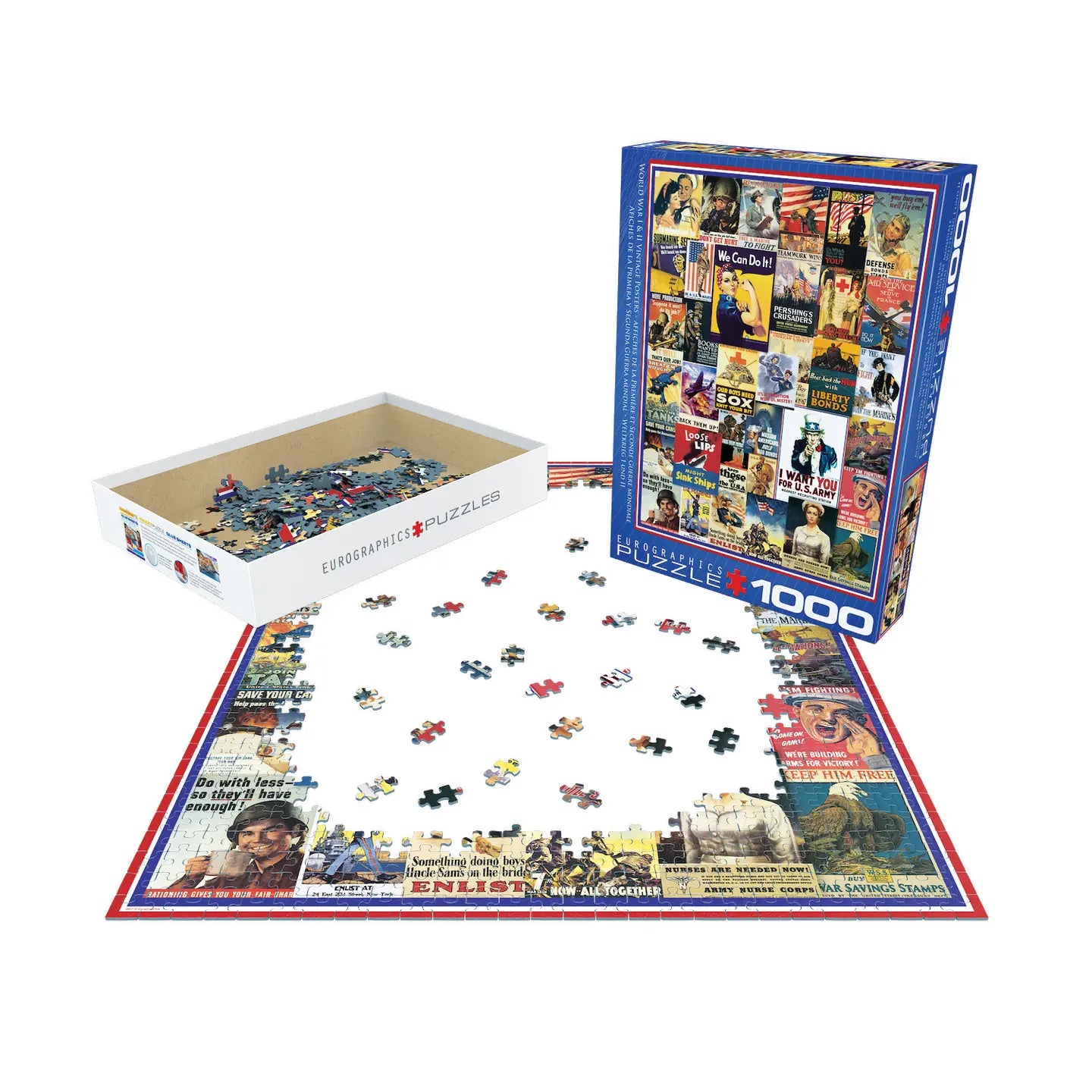 EuroGraphics World War I & II Vintage Posters 1000-Piece Puzzle. Box size: 10" x 14" x 2.37". Finished Puzzle Size: 19.25" x 26.5". A historic collage in honor of the American soldiers and people of WWI and WWII. Celebrate the American spirit with the iconic symbols of the era. Ensuring a snug fit and hours of relaxing enjoyment. Premium Quality: Crafted with premium blueboard and a linen finish for a durable, glare-free experience. Eco-Friendly:Manufactured using recycled and responsibly sourced materials.